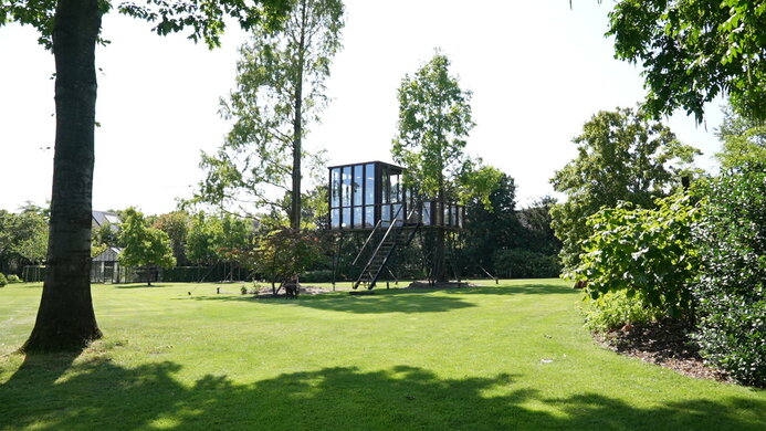 An elevated, sophisticated take on a classic childhood project. HogerHuis crafted this modern and elevated design using Afzelia wood. It features floor-to-ceiling windows on all sides of it and takes a conventional tree house to new heights!