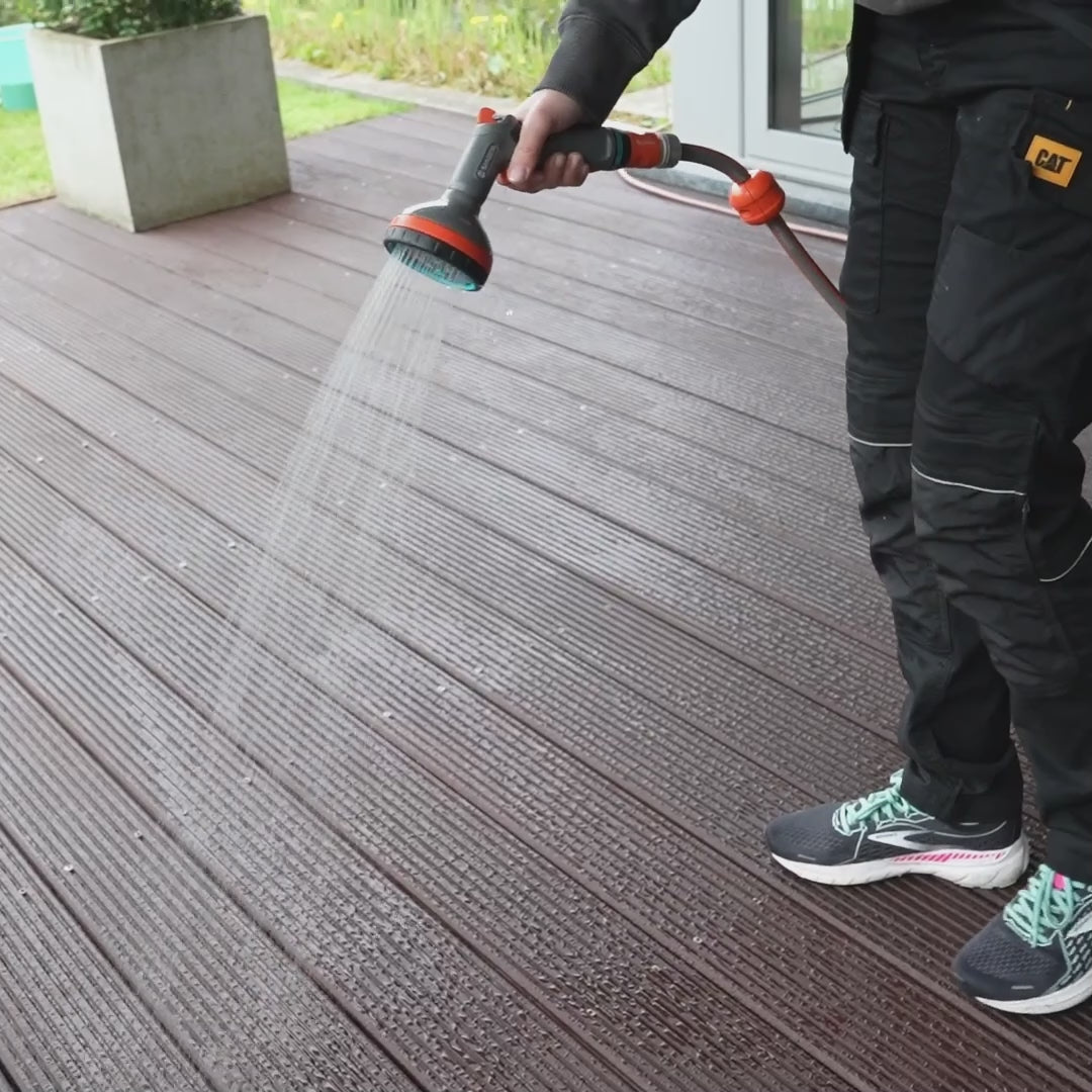 Clean the deck with plain water, using a garden hose and the aid of a scrubbing brush. Wash off any accumulated dirt.